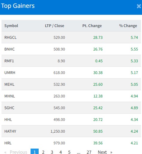 आज सबैभन्दा धेरै राप्ती हाइड्रोका लगानकिर्ताले कमाएका छन् । आज यस कम्पनीका लगानकिर्ताले ५ दशलमव ७४ प्रतिशतका दरले कमाएका छन् । बुद्ध भुमि नेपालका लगानीकर्ताले ५ दशलमव ५५ प्रतिशतका दरले कमाएका छन् । आरबीबी म्युचुअल फन्ड १ का इकाईधनीले ५ दशलमव ३३ प्रतिशतका दरले कमाएका छन् ।