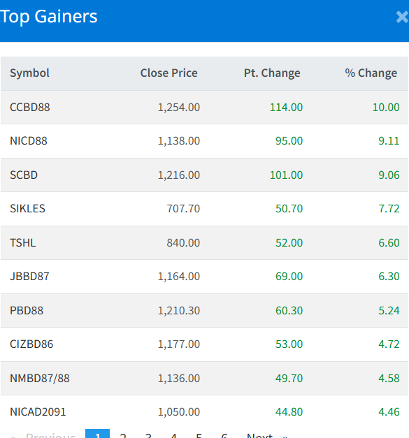 आज सबैभन्दा धेरै सेञ्चुरी डिबेञ्चर २०८८ का इकाईधनीले कमाएका छन् । आज यसका इकाईधनीले १० प्रतिशतका दरले कमाएका छन् । एनआइसी एशिया ऋणपत्र २०८८ का इकाईधनीले ९ दशमलब ११ प्रतिशतका दरले कमाएका छन् । सिक्लेस हाइड्रोपावरका लगानीकर्ताले ७ दशमलव ७२ प्रतिशतका दरले कमाएका छन् ।