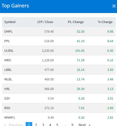 आज सबैभन्दा धेरै ओम मेगा श्रीका लगानीकर्ताले कमाएका छन् । आज यस कम्पनीका लगानीकर्ताले ९ दशलमव ९८ प्रतिशतका दरले कमाएका हुन् । पिपुल्स पावरका लगानीकर्ताले ८ दशलमव ६४ प्रतिशतका दरले कमाएका छन् । उपकार लघुवित्त वित्तीय संस्थाका लगानीकर्ताले ६ दशलमव ३० प्रतिशतका दरले कमाएका छन् । नेपाल पुनर्बीमाका लगानीकर्ताले ६ दशलमव १६ प्रतिशतका दरले कमाएका छन् ।