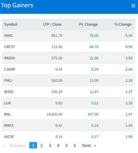 आज सबैभन्दा धेरै नेपाल माइक्रो इन्स्योरेन्स र क्रेष्ट माइक्रो लाइफका लगानीकर्ताले कमाएका छन् । आज यी दुई कम्पनीका लगानीकर्ताले ९ दशलमव ९९ प्रतिशतका दरले कमाएका हुन् । राधि विद्युत कम्पनीका लगानकिर्ताले ३ दशलमव ८० प्रतिशतका दरले कमाएका छन् ।