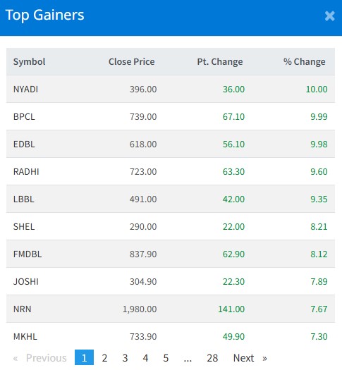 आज सबैभन्दा धेरै न्यादी हाइड्रोपावर कम्पनीका लगानीकर्ताले कमाएका छन् । आज यस कम्पनीका लगानीकर्ताले १० प्रतिशतका दरले कमाएका हुन् । बुटवल पावर कम्पनीका लगानीकर्ताले ९ दशमलव ९९ प्रतिशतका दरले कमाएका छन् । एक्सेल डेभलपमेन्ट बैंकका लगानीकर्ताले ९ दशमलव ९८ प्रतिशतका दरले कमाएका छन् ।