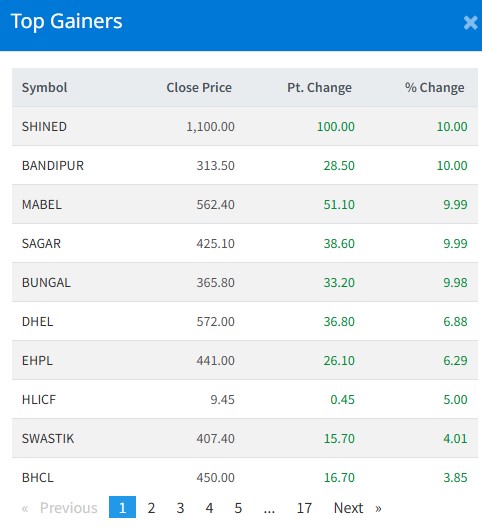 आज सबैभन्दा धेरै शाइन रेसुङगा डिबेञ्चर र बन्दीपुर केबलकारका लगानीकर्ताले कमाएका छन् । आज यी दुई कम्पनीका लगानीकर्ताले १० प्रतिशतका दरले कमाएका छन् । माबिलुङ र सागर डिष्टिलरीका लगानीकर्ताले ९ दशमलव ९९ प्रतिशतका दरले कमाएका हुन् ।