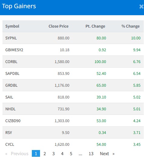 आज सबैभन्दा धेरै एसवाई प्यानलका लगानीकर्ताले कमाएका छन् । आज एसवाई प्यानल कम्पनीका लगानीकर्ताले १० प्रतिशतका दरले कमाएका हुन् । ग्लोबल आइएमई सम्मुनत योजनका इकाईधनीले ९ दशमलव ९४ प्रतिशतका दरले कमाउका छन् । कर्पोरेट डेभलपमेन्ट बैंकका लगानीकर्ताले ६ दशमलव ७६ प्रतिशतका दरले कमाएका हुन् ।