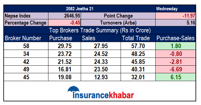 बजारमा ५ अर्ब १६ करोड रुपैयाँको कारोबार भएको दिन ब्रोकर नम्बर ५८ बाट सर्वाधिक रकमको कारोबार भएको छ। यो ब्रोकरबाट ५७ करोड ७० लाख रुपैयाँको कारोबार भएको छ। जसमा २९ करोड ७५ लाख रुपैयाँको खरिद छ भने २७ करोड ९५ लाख रुपैयाँको बिक्री छ।