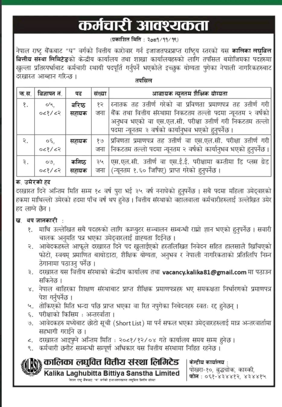काठमाडौं । कालिका लघुवित्त वित्तीय संस्थाले माग गरेको कर्मचारीको लागि आवेदन दिने आज अन्तिम दिन रहेको छ । लघुवित्तले विभिन्न ३ पदका लागि कर्मचारी माग गरेको छ । कम्पनीले वरिष्ठ सहायकका लागि १२ जना, सहायकका लागि १७ जना तथा कनिष्ठ सहायकका लागि ३५ जना कर्मचारी माग गरेको हो । लघुवित्तले आफ्नो केन्द्रीय कार्यालय तथा विभिन्न शाखा कार्यालयका लागि कर्मचारी माग गरेको हो । ईच्छुक तथा योग्यता पुगेकाले आज चैत ४ गतेभित्र आवेदन दिनुपर्नेछ ।
