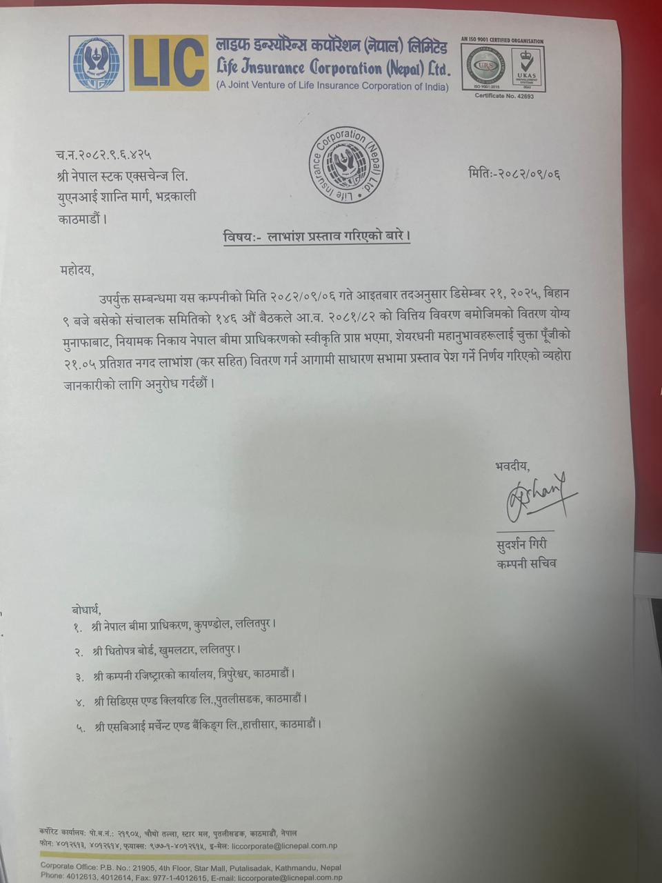 काठमाडौं । एलआइसी नेपालले आर्थिक वर्ष २०८१।८२ का लागि लाभांश घोषणा गरेको छ। कम्पनी सञ्चालक समितिको आज पुस ६ गते बैठकले उक्त आर्थिक वर्षको मुनाफाबाट आफ्ना शेयरधनीहरुलाई नगद लाभांश वितरण गर्ने हो।