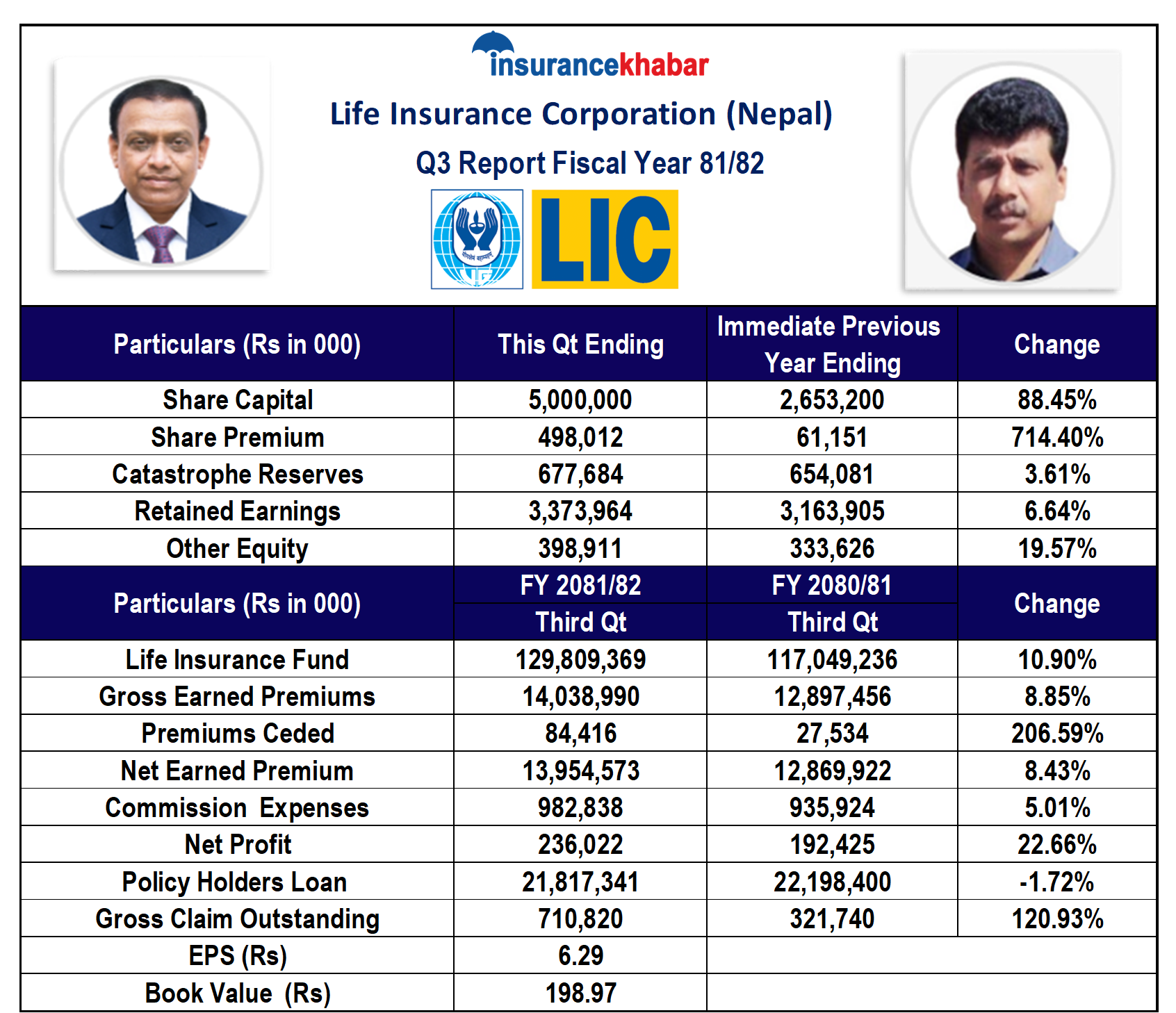 काठमाडौं । एलआइसी नेपालले चालु आर्थिक वर्षको तेस्रो त्रैमाससम्मको अपरिष्कृत वित्तीय विवरण सार्वजनिक गरेको छ । वित्तीय विवरणअनुसार कम्पनीको अधिकांश सूचकमा बृद्धि भएको देखिएको छ ।
