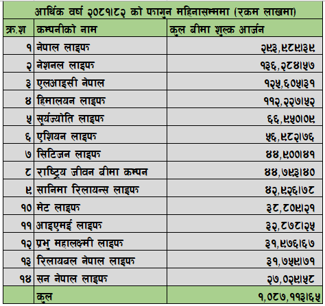 सूर्यज्योति लाइफले ६ अर्ब ६९ करोड रुपैयाँ कुल बीमाशुल्क संकलन गरेको छ । एशियन लाइफले ५ अर्ब ६९ करोड रुपैयाँ कुल बीमाशुल्क संकलन गरेको छ । सिटिजन लाइफले ४ अर्ब ४९ करोड रुपैयाँ कुल बीमाशुल्क संकलन गरेको छ । राष्ट्रिय जीवन बीमा कम्पनीले ४ अर्ब ४७ करोड रुपैयाँ कुल बीमाशुल्क संकलन गरेको छ ।