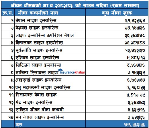 हिमालयन लाइफले २ अर्ब २ करोड रुपैयाँ कुल बीमाशुल्क संकलन गरेको छ । सूर्यज्योति लाइफले १ अर्ब २४ करोड रुपैयाँ कुल बीमाशुल्क संकलन गरेको छ । एशियन लाइफले ९४ करोड ८६ लाख रुपैयाँ कुल बीमाशुल्क संकलन गरेको छ । सिटिजन लाइफले ८५ करोड ६४ लाख रुपैयाँ कुल बीमाशुल्क संकलन गरेको छ ।सानिमा रिलायन्स लाइफले ७१ करोड ९५ लाख रुपैयाँ कुल बीमाशुल्क संकलन गरेको छ । आइएमई लाइफले ६७ करोड ५ लाख रुपैयाँ कुल बीमाशुल्क संकलन गरेको छ । प्रभु महालक्ष्मी लाइफले ६८ लाख रुपैयाँ कुल बीमाशुल्क संकलन गरेको छ । रिलायबल नेपाल लाइफले ५८ करोड १७ लाख रुपैयाँ कुल बीमाशुल्क संकलन गरेको छ । मेट लाइफले ५३ करोड ९९लाख रुपैयाँ कुल बीमाशुल्क संकलन गरेको छ । राष्ट्रिय जीवन बीमा कम्पनीले ४३ करोड ३९ लाख रुपैयाँ कुल बीमाशुल्क संकलन गरेको छ । सन नेपाल लाइफले ३६ करोड ५२ लाख रुपैयाँ कुल बीमाशुल्क संकलन गरेको छ ।