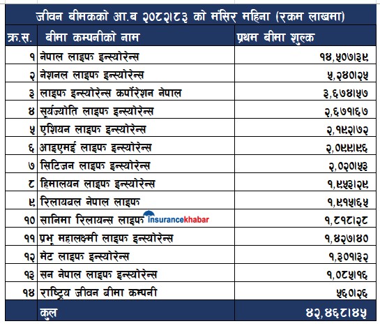 प्रभु महालक्ष्मी लाइफले १४ करोड २७ लाख रुपैयाँ बीमाशुल्क संकलन गरेको छ । मेट लाइफले १३ करोड १ लाख बीमाशुल्क संकलन गरेको छ । सन नेपाल लाइफले १० करोड ८५ लाख बीमाशुल्क संकलन गरेको छ । राष्ट्रिय जीवन बीमा कम्पनीले ५ करोड ६० लाख रुपैयाँ बीमाशुल्क संकलन गरेको छ ।