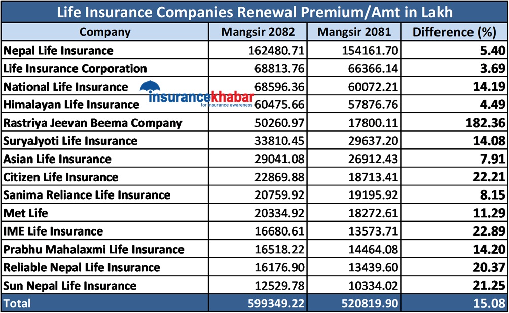 चालु वर्षको मंसिरसम्म राष्ट्रिय जीवन बीमा कम्पनीले ५ अर्ब २ करोड ६० लाख रुपैयाँ नवीकरण बीमाशुल्क संकलन गर्दा सूर्यज्योति लाइफले ३ अर्ब ३८ करोड १० लाख रुपैयाँ, एसियन लाइफले २ अर्ब ९० करोड ४१ लाख रुपैयाँ, सिटिजन्स लाइफले २ अर्ब २८ करोड ६९ लाख रुपैयाँ र सानिमा रिलायन्स लाइफले २ अर्ब ७ करोड ५९ लाख रुपैयाँ संकलन गरेका छन्। अघिल्लो वर्षको तुलनामा समीक्षा अवधिमा राष्ट्रिय जीवन बीमा कम्पनीको १८२.३६ प्रतिशत, सूर्यज्योति लाइफको १४.०८ प्रतिशत, एसियन लाइफको ७.९१ प्रतिशत, सिटिजन लाइफको २२.२१ प्रतिशत र सानिमा रिलायन्स लाइफको ८.१५ प्रतिशतले नवीकरण बीमाशुल्क बढेको छ।