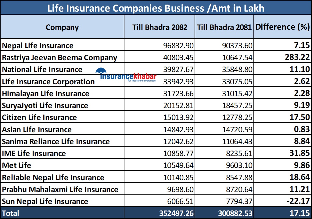 नेपाल बीमा प्राधिकरणका अनुसार १४ वटा जीवन बीमकले ३५ अर्ब २४ करोड ९७ लाख रुपैयाँ कुल बीमाशुल्क संकलन गरेका हुन्। अघिल्लो वर्ष २०८१।८२ को भदौसम्म कम्पनीहरुले ३० अर्ब ८ करोड ८२ लाख रुपैयाँ भित्र्याएका थिए। अघिल्लो वर्षको तुलनामा समीक्षा अवधिसम्म कम्पनीहरुको व्यापार १७.१५ प्रतिशतले बढेको छ।