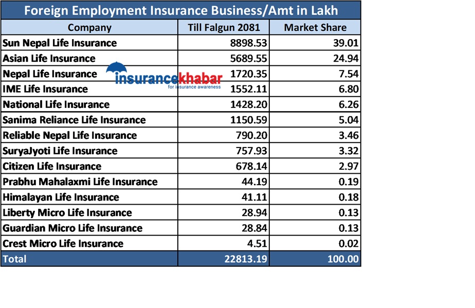 चालु आर्थिक वर्षको फागुनसम्म वैदेशिक रोजगार बीमालेख बिक्री गरेर आइएमई लाइफले १५ करोड ५२ लाख रुपैयाँ (६.८० प्रतिशत), नेसनल लाइफले १४ करोड २८ लाख रुपैयाँ (६.२६ प्रतिशत), सानिमा रिलायन्स लाइफले ११ करोड ५० लाख रुपैयाँ (५.०४ प्रतिशत), रिलायबल नेपाल लाइफले ७ करोड ९० लाख रुपैयाँ (३.४६ प्रतिशत), सूर्यज्योति लाइफले ७ करोड ५७ लाख रुपैयाँ (३.३२ प्रतिशत), सिटिजन लाइफले ६ करोड ७८ लाख रुपैयाँ (२.९७ प्रतिशत), प्रभु महालक्ष्मी लाइफले ४४ लाख १९ हजार रुपैयाँ (०.१९ प्रतिशत) र हिमालयन लाइफले ४१ लाख ११ हजार रुपैयाँ (०.१८ प्रतिशत) कुल बीमाशुल्क आर्जन गरेका छन्।