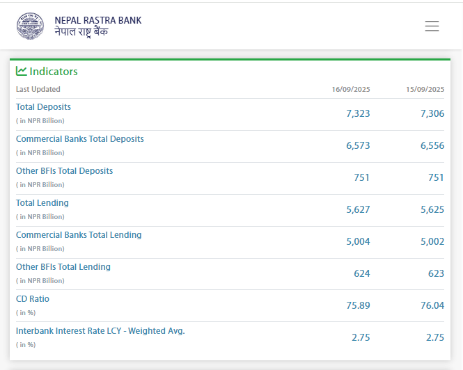 बैंकहरुको औसत सीडी रेसियो घट्दै ७५.८९ प्रतिशत कायम भएको छ भने अन्तरबैंक ब्याजदर २.७५ प्रतिशत छ। अघिल्लो दिन सीडी रेसियो ७६.०४ प्रतिशत थियो।