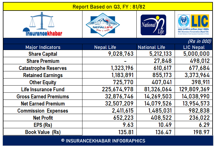 काठमाडौं । नेपाल लाइफ, नेसनल लाइफ र लाइफ इन्स्योरेन्स कर्पोरेसन (एलआईसी नेपाल) नेपालमा स्थापित र पुराना जीवन बीमा कम्पनी हुन्। यी कम्पनीले आर्थिक वर्ष २०८१।८२ तेस्रो त्रैमाससम्मको वित्तीय प्रतिवेदन सार्वजनिक गरेको अवस्थामा इन्स्योरेन्स खबरले गरेको तुलनात्मक अध्ययनः