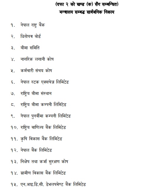 हाल अर्थ मन्त्रालय सम्बद्ध नेपाल राष्ट्र बैंक, नेपाल धितोपत्र बोर्ड, नेपाल बीमा प्राधिकरण, नागरिक लगानी कोष, कर्मचारी सञ्चय कोष, नेपाल स्टक एक्सचेन्ज, राष्ट्रिय बीमा संस्थान, राष्ट्रिय जीवन बीमा कम्पनी, नेपाल पुनर्बीमा कम्पनी, राष्ट्रिय वाणिज्य बैंक, कृषि विकास बैंक, नेपाल बैंक, निक्षेप तथा कर्जा सुरक्षण कोष, ग्रामीण विकास लघुवित्त वित्तीय संस्था र एनआईडीसी डेभलपमेन्ट बैंक रहेका छन्। यीमध्ये केही सार्वजनिक निकाय जस्तै– साविक बीमा समिति, राष्ट्रिय बीमा कम्पनी, ग्रामीण विकास बैंकलगायतको नाम परिवर्तन भइसकेको अवस्थामा पनि अर्थ मन्त्रालयले अवगत नै नभएको देखिएको छ।