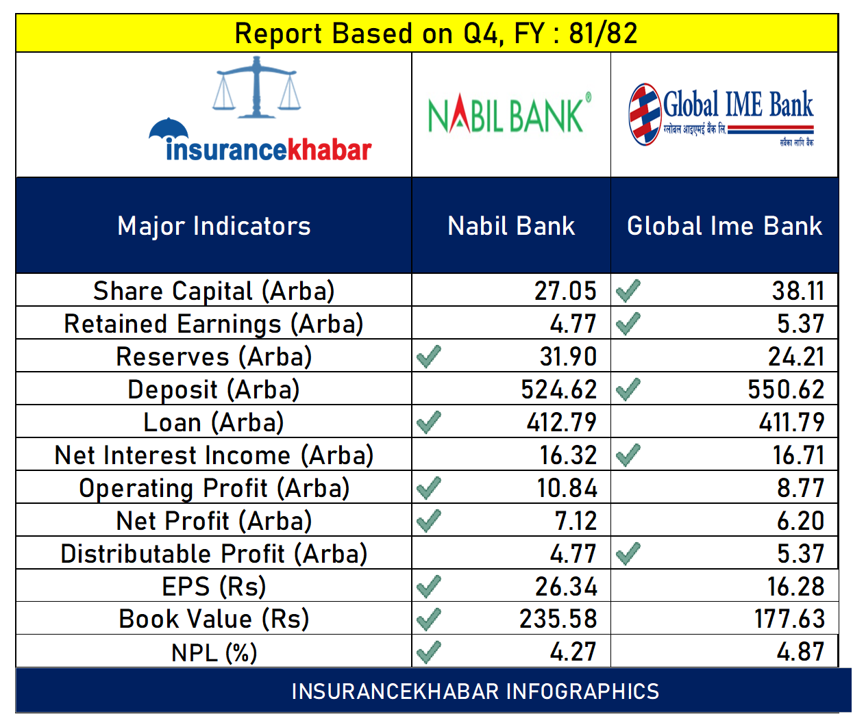 काठमाडौं । नबिल र ग्लोबल आइएमई बैंकले गत आर्थिक वर्ष २०८१।८२ को चौथो त्रैमासको वित्तीय विवरण सार्वजनिक गरेको अवस्थामा दुई बैंकबीच इन्स्योरेन्स खबरले प्रमुख वित्तीय सूचकलाई आधार मानेर गरेको तुलनात्मक अध्ययनः