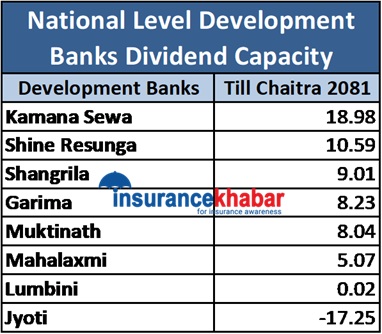 यसैगरी चैतसम्म सांग्रिला डेभलपमेन्ट बैंकले ९.०१ प्रतिशत, गरिमा विकास बैंकले ८.२३ प्रतिशत, मुक्तिनाथ विकास बैंकले ८.०४ प्रतिशत, महालक्ष्मी विकास बैंकले ५.०७ प्रतिशत र लुम्बिनीले ०.०२ प्रतिशत लाभांश क्षमता बनाएका छन्। ज्योति विकास बैंकको लाभांश क्षमता भने १७.२५ प्रतिशतले ऋणात्मक देखिएको छ।