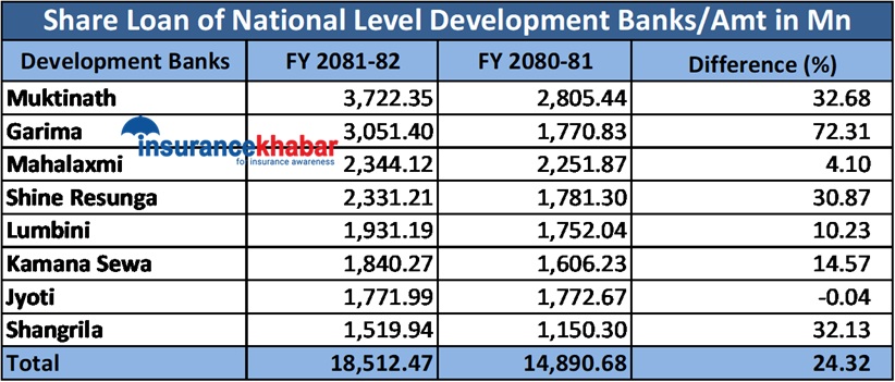 अघिल्लो वर्षको तुलनामा समीक्षा वर्ष राष्ट्रियस्तरका विकास बैंकमध्ये ७ वटा शेयर धितो कर्जा प्रवाह बढेको छ भने एउटाको घटेको छ। सर्वाधिक शेयर लोन दिनेमा मुक्तिनाथ रहेको छ भने वृद्धिदरका हिसाबले गरिमा रहेको छ।