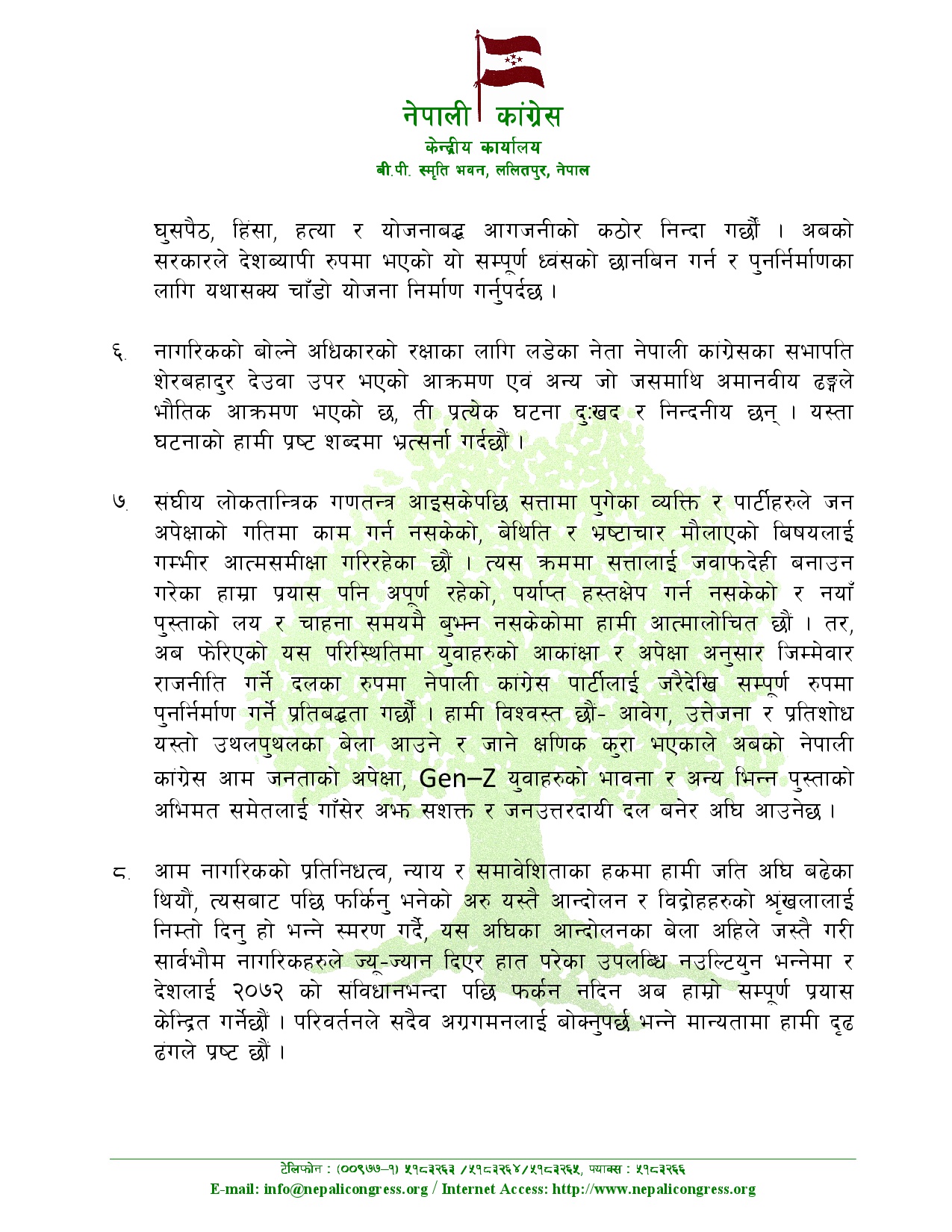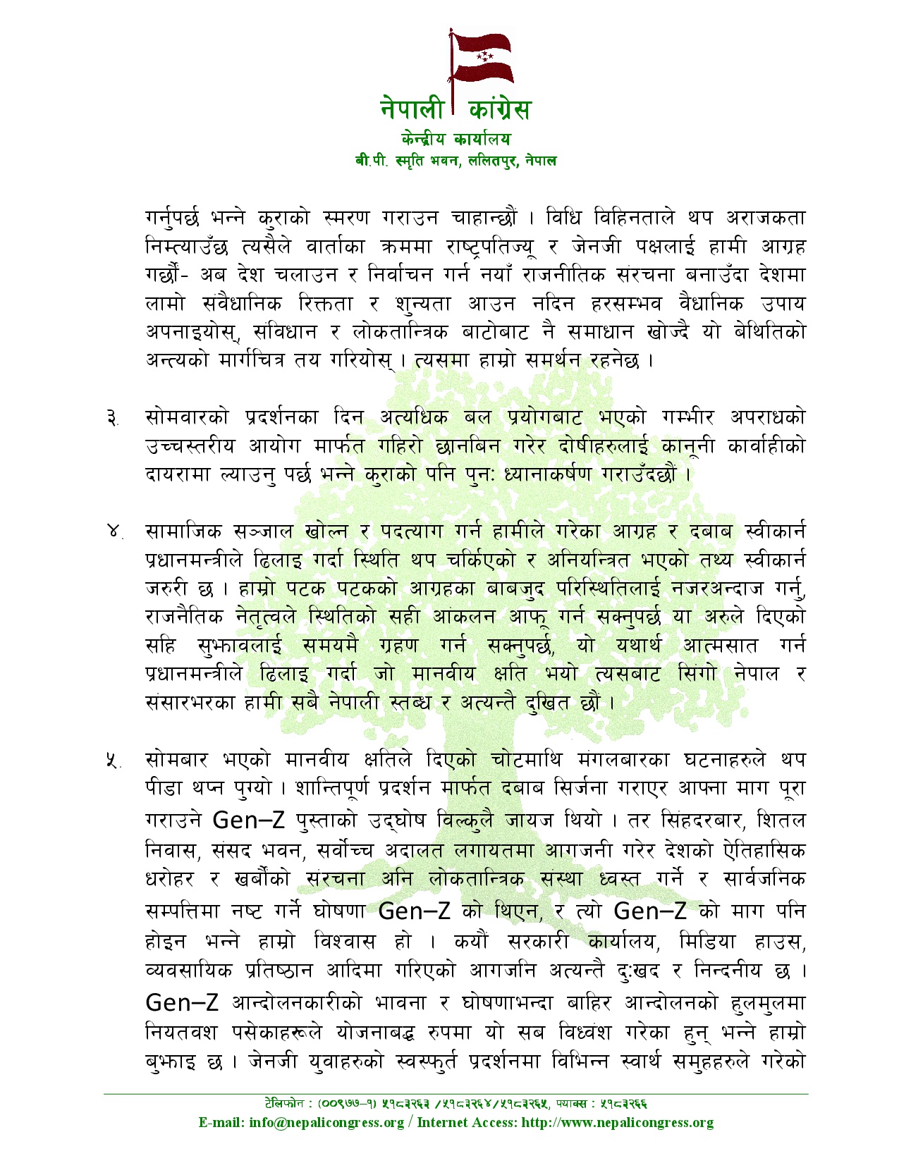 आवेग, उत्तेजना र प्रतिशोध यस्तो उथलपुथलका बेला आउने र जाने क्षणिक कुरा भएकोले अबको नेपाली कांग्रेस आमजनताको अपेक्षा, जेनजी युवाको भावना र अन्य भिन्न पुस्ताको अभितमसमेतलाई गाँसेर जनउत्तरदायी दल बन्ने विज्ञप्तिमा प्रतिबद्धता गरिएको छ।