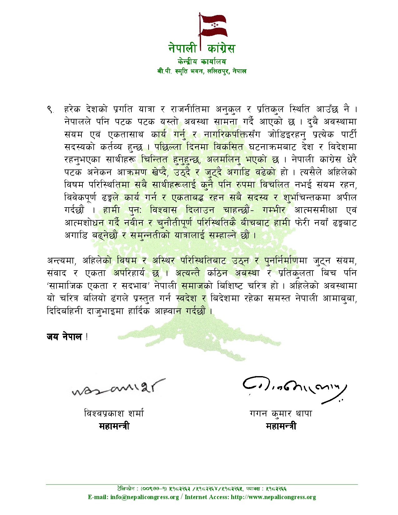 कांग्रेस महामन्त्रीद्वय विश्वप्रकाश शर्मा र गगन थापाद्वारा जारी संयुक्त विज्ञप्तिमा यस्तो प्रण गरिएको हो। ‘आमनागरिकको प्रतिनिधित्व, न्याय र समावेशिताका हकमा हामी जति अघि बढेका थियौँ, त्यसबाट पछि फर्किनु भनेको अरु यस्तै आन्दोलन र विद्रोहहरुको शृंखलालाई निम्तो दिनु हो भन्ने स्मरण गर्दै यसअघिका आन्दोलनका बेला अहिलेजस्तै गरी सार्वभौम नागरिकले जिउज्यान दिएर हात परेको उपलब्धि नउल्टिनु भन्नेमा र देशलाई २०७२ को संविधानभन्दा पछि फर्किन नदिनु अब हाम्रो महत्वपूर्ण प्रयासमा केन्द्रित छौँ’, विज्ञप्तिमा भनिएको छ, ‘परिवर्तनले सदैव अग्रमनलाई बोक्नुपर्छ भन्ने मान्यतामा हामी दृढ ढंगले प्रस्ट छौँ।