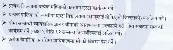 प्राधिकरणले बुधबार सबै जीवन बीमकलाई सामूहिक निर्देशन जारी गर्दै तोकिएका जिल्लाहरुमा प्रत्येक पालिकाको एउटा विद्यालयमा कार्यक्रम गर्न र बीमा सम्बन्धि व्यवहारिक ज्ञान सहित बीमाको आवश्यक्ता झल्काउने गरी बीमा सचेतना निर्देशन दिएको हो।