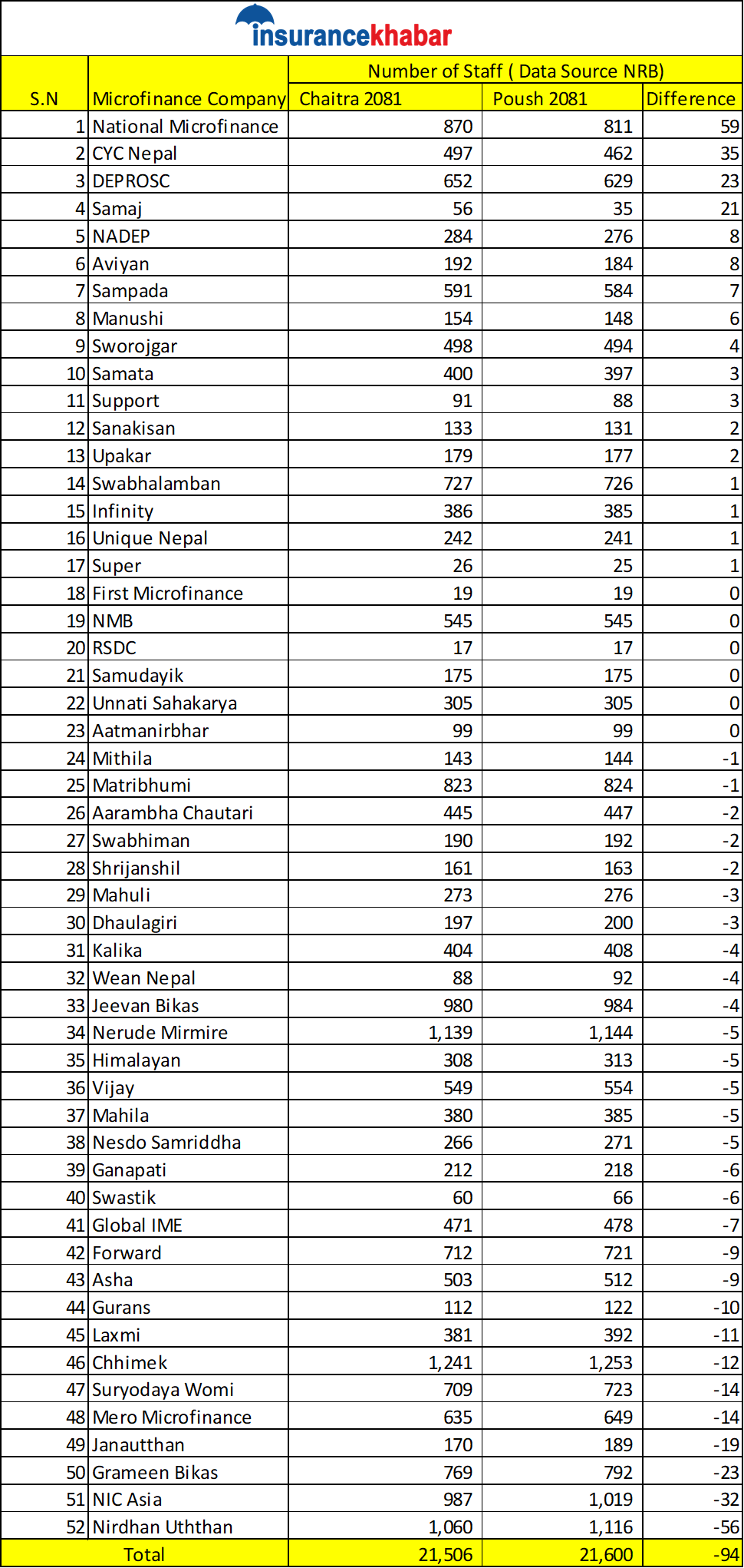 तीन महिनाको अवधिमा नेसनल माइक्रोफाइनान्समा सर्वाधिक ५९ कर्मचारी थपिएका छन्। यो संस्थामा पुस मसान्तमा ८११ कर्मचारी रहेकोमा चैत मसान्तसम्म आइपुग्दा कर्मचारी संख्या बढेर ८७० पुगेको छ।