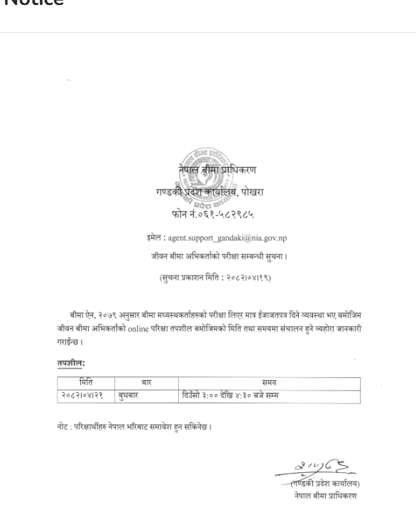 काठमाडौं । नेपाल बीमा प्राधिकरण गण्डकी प्रदेशले आज अभिकर्ता परीक्षा सञ्चालन गर्दैछ । प्राधिकरणले आज साउन २१ गते बुधबार सो परीक्षा सञ्चालन गर्न लागेको जनाएको छ । सो परीक्षा दिनको ३ बजेबाट ४ः३० बजेसम्म सञ्चालन हुनेछ ।