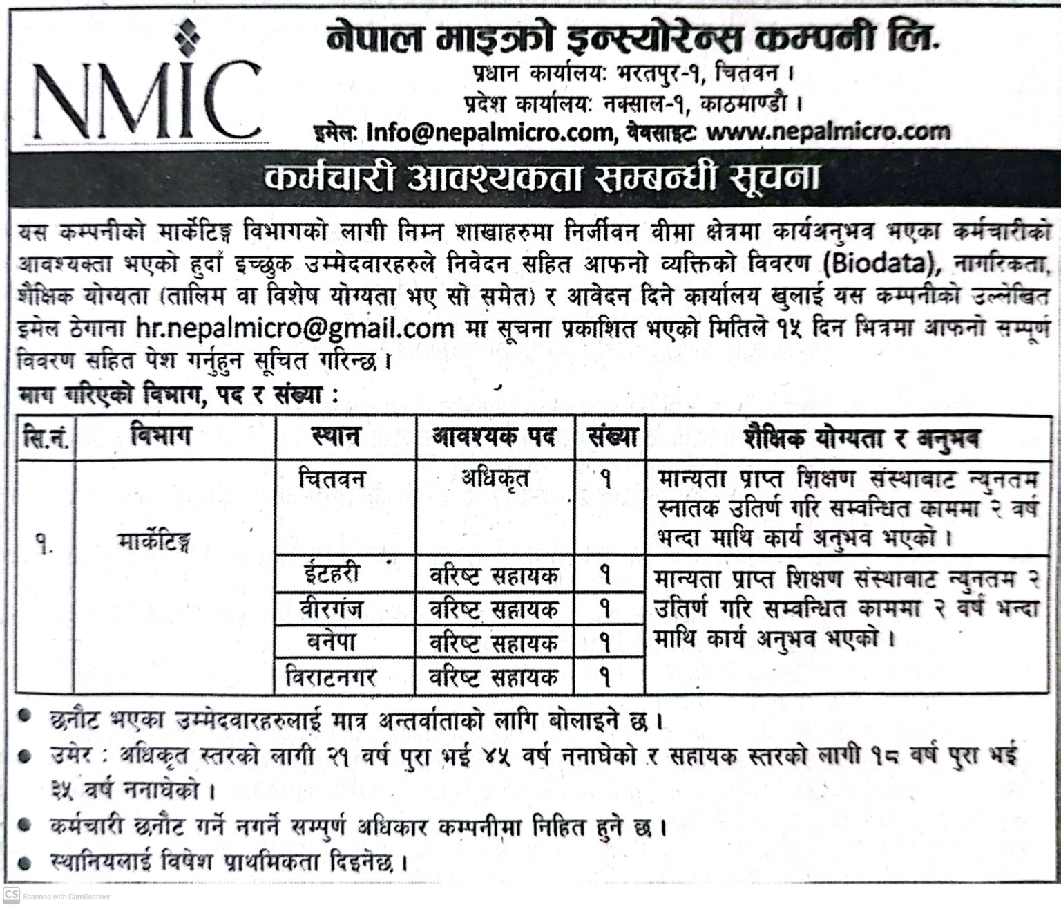 काठमाडौं । नेपाल माइक्रो इन्स्योरेन्सले विभिन्न पदका लागि कर्मचारी माग गरेको छ । कम्पनीले मार्केटिङ विभाग चितवनका लागि अधिकृतमा १ जना, वरिष्ठ सहायकका लागि इटहरी, बनेपा, वीरगञ्ज र विराटनगरमा १/ १ जना कर्मचारी माग गरेको हो । उक्त पदका लागि न्युनतम प्लस टु गरी दुई वर्षको कार्य अनुभव भएको हुनुपर्नेछ । ईच्छुक तथा योग्यता पुगेकाले सूचना प्रकाशित भएको मितिले १५ दिनभित्र आवेदन दिनुपर्नेछ ।