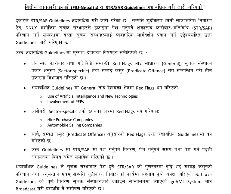 राष्ट्र बैंकले शंकास्पद कारोबार र गतिविधि (एसटीआर/एसएआर) गाइडलाइन्स अद्यावधिक गरी जारी गरेको छ । सम्पत्ति शुद्धीकरण (मनी लाउन्डरिङ) निवारण ऐन, २०६४ बमोजिम सूचक संस्थाहरुले इकाईमा पेस गर्नुपर्ने शंकास्पद कारोबार र गतिविधि पहिचान गर्ने सम्बन्धमा यस्ता सूचक संस्थाहरुलाई व्यवहारिक मार्गदर्शन प्रदान गर्ने उद्देश्यसहित उक्त गाइडलाइन्समा संंशोधन गरेको हो।