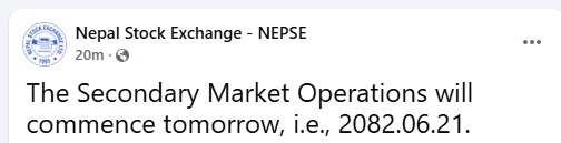 नेप्सेले आज एक सूचना जारी गर्दै धितोपत्र दोस्रो बजार भोलि असोज २१ गतेबाट खुल्ने जानकारी गराएको हो। नेप्सेको कार्यालय भने आज असोज २० गतेबाट खुल्नेछ।
