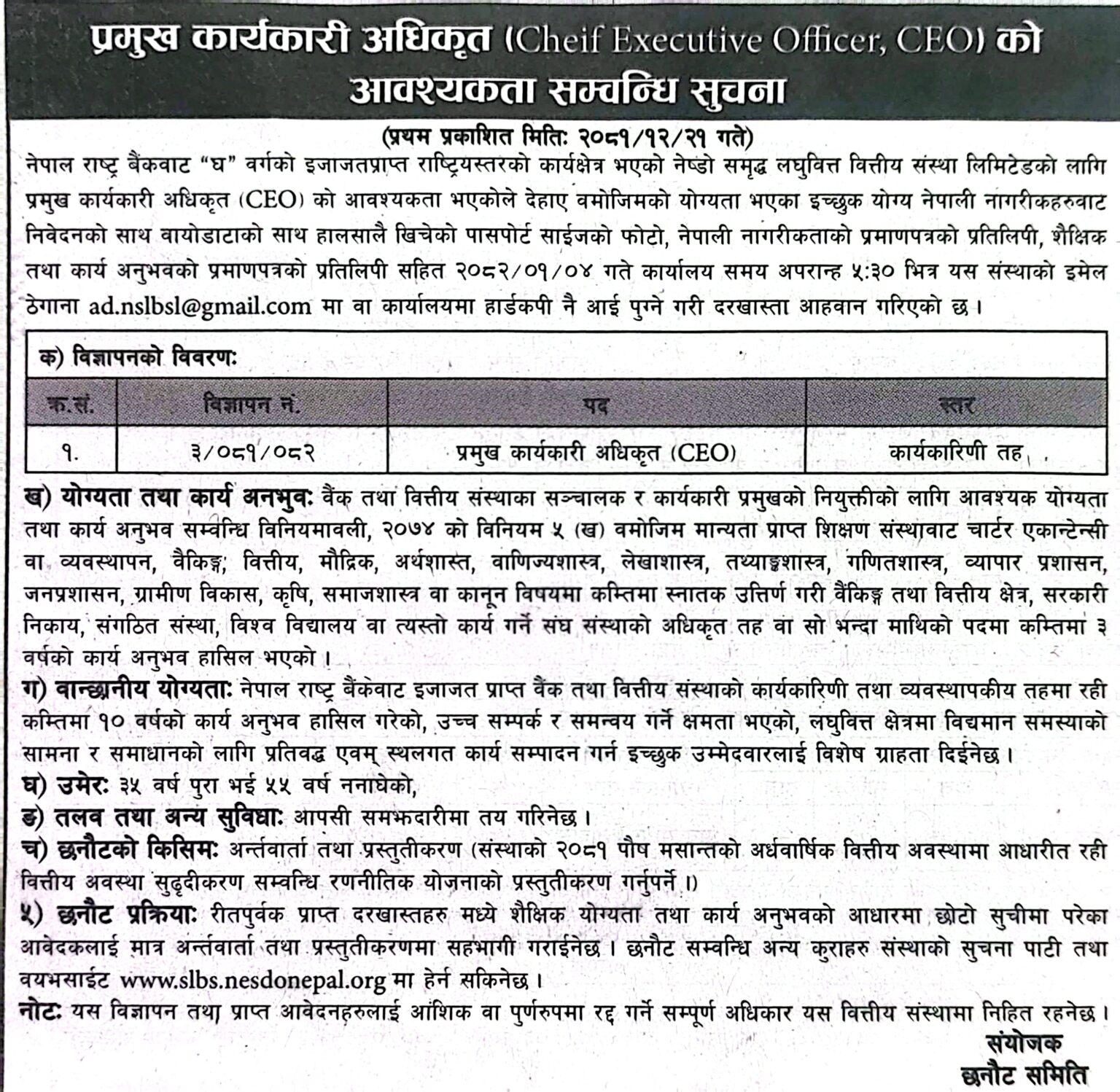 काठमाडौं । नेष्डो समृद्ध लघुवित्त वित्तीय संस्था लिमिटेडले प्रमुख कार्यकारी अधिकृत (सीईओ) माग गरेको छ। सीईओका लागि उमेरको हकमा भने ३५ वर्ष पूरा भई ५५ वर्ष ननाघेको हुनु पर्नेछ। साथै, बैंक तथा वित्तीय संस्थाका सञ्चालक र कार्यकारी प्रमुखको नियुक्तिको लागि आवश्यक योग्यता तथा कार्यानुभव सम्बन्धी विनियमावली, २०७४ को विनियम ५ (ख) बमोजिम मान्यता प्राप्त शिक्षण संस्थावाट चार्टर एकान्टेन्सी वा व्यवस्थापन, बैंकिङ , वित्तीय, मौद्रिक, अर्थशास्त्र, वाणिज्यशास्त्र, लेखाशास्त्र, तथ्याङ्कशास्त्र, गणितशास्त्र, व्यापार प्रशासन, जनप्रशासन, ग्रामीण विकास, कृषि, समाजशास्त्र वा कानून विषयमा कम्तीमा स्नातक उत्तीर्ण गरी बैंकिङ तथा वित्तीय क्षेत्र, सरकारी निकाय, संगठित संस्था, विश्व विद्यालय वा त्यस्तो कार्य गर्ने संघ संस्थाको अधिकृत तह वा सो भन्दा माथिको पदमा कम्तीमा ३ वर्ष काम गरेको अनुभव भएको हुनु पर्नेछ।