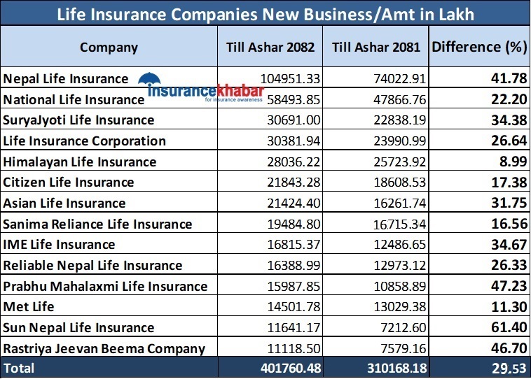 गत आर्थिक वर्षमा आइएमई लाइफले १ अर्ब ६८ करोड १५ लाख रुपैयाँ, रिलायबल नेपाल लाइफले १ अर्ब ६३ करोड ८८ लाख रुपैयाँ, प्रभु महालक्ष्मी लाइफले १ अर्ब ५९ करोड ८७ लाख रुपैयाँ, मेट लाइफले १ अर्ब ४५ करोड १ लाख रुपैयाँ, सन नेपाल लाइफले १ अर्ब १६ करोड ४१ लाख रुपैयाँ र राष्ट्रिय जीवन बीमा कम्पनीले १ अर्ब ११ करोड १८ लाख रुपैयाँ प्रथम बीमाशुल्क संकलन गरेका छन्। अघिल्लो वर्षको तुलनामा नयाँ व्यापार आइएमई लाइफको ३४.६७ प्रतिशत, रिलायबल नेपाल लाइफको २६.३३ प्रतिशत, प्रभु महालक्ष्मी लाइफको ४७.२३ प्रतिशत, मेट लाइफको ११.३० प्रतिशत, सन नेपाल लाइफको ६१.४० प्रतिशत र राष्ट्रिय जीवन बीमा कम्पनीको ४६.७० प्रतिशतले बढेको छ।