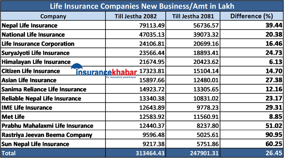यसैगरी चालु आर्थिक वर्षको जेठसम्म सूर्यज्योति लाइफले २ अर्ब ३५ करोड ६६ लाख रुपैयाँ, हिमालयन लाइफ २ अर्ब १६ करोड ७४ लाख रुपैयाँ, सिटिजन लाइफले १ अर्ब २३ करोड २३ लाख रुपैयाँ, एसियन लाइफले १ अर्ब ५८ करोड ९७ लाख रुपैयाँ र सानिमा रिलायन्स लाइफले १ अर्ब ४९ करोड २३ लाख प्रथम बीमाशुल्क संकलन गरेका छन्। अघिल्लो वर्ष जेठसम्मको तुलनामा नयाँ व्यापार सूर्यज्योति लाइफको २४.७३ प्रतिशत, हिमालयन लाइफको ६.१३ प्रतिशत, सिटिजन लाइफको १४.७० प्रतिशत, एसियन लाइफको २७.३८ प्रतिशत र सानिमा रिलायन्स लाइफको १२.१६ प्रतिशतले बढेको छ।