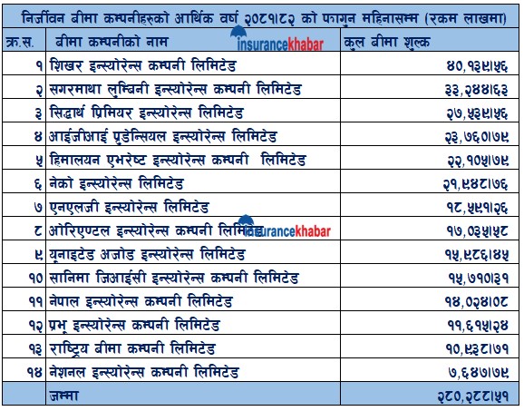 नेपाल इन्स्योरेन्सले १ अर्ब ४० करोड रुपैयाँ कुल बीमाशुल्क संकलन गरेको छ । प्रभु इन्स्योरेन्सले १ अर्ब १६ करोड रुपैयाँ कुल बीमाशुल्क संकलन गरेको छ । राष्ट्रिय बीमा कम्पनीले १ अर्ब ९करोड रुपैयाँ कुल बीमाशुल्क संकलन गरेको छ । नेशनल इन्स्योरेन्सले ७६ करोड ४७ लाख रुपैयाँ बीमाशुल्क संकलन गरेको छ ।