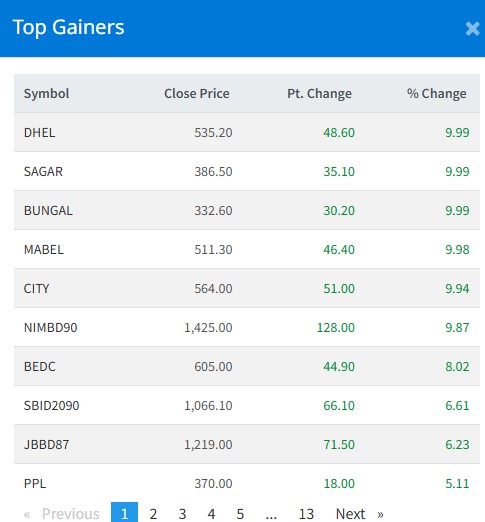 आज सबैभन्दा धेरै दरमखोला हाइड्रोपावर, बुङगल हाइड्रो र सागर डिष्टिलरीका लगानीकर्ताले कमाएका छन् । आज यी ३ कम्पनीका लगानीकर्ताले ९ दशलमव ९९ प्रतिशतका दरले कमाएका हुन् । माबिलुङ इनर्जीका लगानीकर्ताले ९ दशमलव ९८ प्रतिशतका दरले कमाएका छन् ।