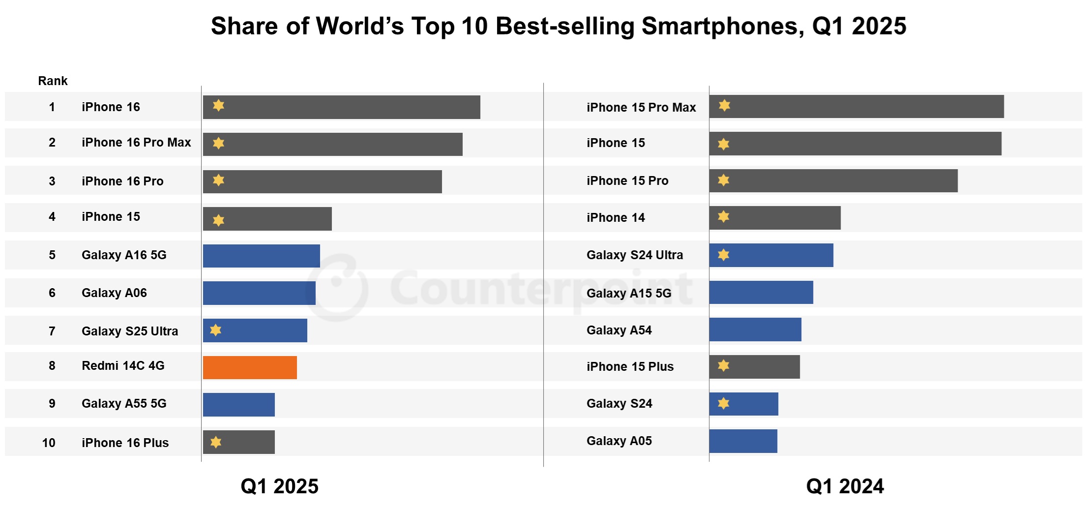 यो सूचीमा एप्पल, सामसङ र रेडमीका स्मार्टफोन समावेश गरेका छन्। यो सूचीको शीर्ष स्थानमा एप्पलको आइफोन १६ परेको छ। यो स्मार्टफोन वर्ष २०२५ को पहिलो त्रैमासमा सबैभन्दा धेरै बिक्री भएको छ। पछिल्लो २ वर्षमा पहिलोपटक एप्पलको स्मार्टफोन बिक्रीको शीर्ष स्थानमा उक्लिएको हो।