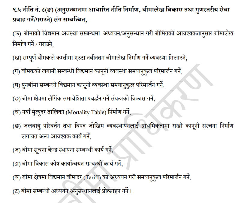 नयाँ मृत्युदर तालिका विकास गर्ने, बीमा पहुँच र नेतृत्वमा लैङ्गिक समावेशीकरणलाई प्रवर्द्धन गर्ने, बीमा सूचना केन्द्र स्थापना गर्ने र बीमा विकास कोष सञ्चालन गर्ने,