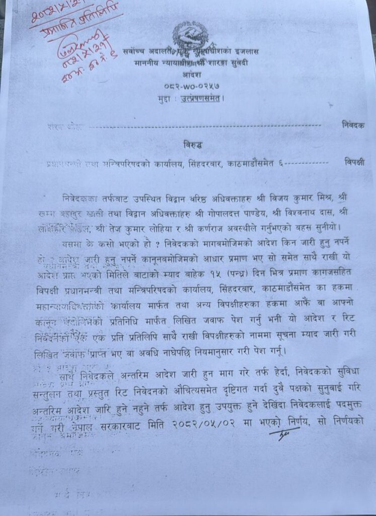 मन्त्रीपरिषदले आफूलाई पदमुक्त गर्न गरेको निर्णय खारेजी र पुनर्बहालीको माग गर्दै उनले अन्तरिम आदेश माग गर्दै सर्वोच्च अदालतमा रिट दायर गरेका थिए । सर्वोच्च अदालतले अल्पकालीन आदेश जारी गर्दै मन्त्री परिषदको निर्णयहरू कार्यान्वयन नगरी यथाअवस्थामा राख्न भदाै २३ गते अल्पकालीन आदेश दिएको थियो।