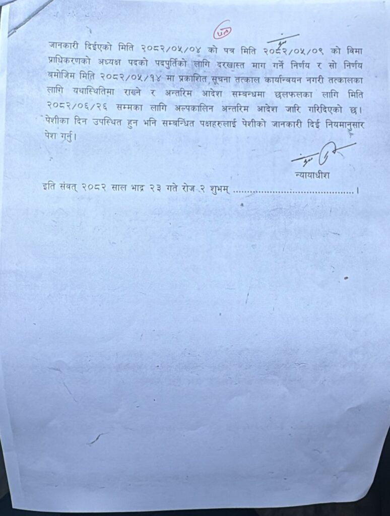 सर्वोच्च अदालतले उनलाई पदमुक्त गरिएको सम्बन्धि मन्त्री परिषदको निर्णय, बीमा प्राधिकरणको अध्यक्ष पदको पदपूर्तीका लागि दरखास्त माग गर्ने निर्णय र सो निर्णय बमोजिम मिति २०८२ भदाै १४ गतेमा प्रकाशित सूचना तत्काल कार्यान्वयन नगरी यथास्थितिमा राख्ने र अन्तरिम आदेश सम्बन्धमा छलफलका लागि असोज २६ गते सम्मका लागि अल्पकालीन आदेश जारी गरेको थियो।