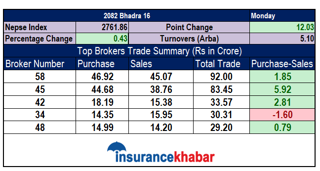 काठमाडौं । सोमबार नेप्से परिसूचक २७६१.८६ विन्दुमा पुगेर बन्द भएको छ । यस दिन परिसूचक १२.०३ अंकले बढेको छ।५ अर्ब १० करोड कारोबार भएको दिन ब्रोकर नम्बर ५८ बाट सर्वाधिक रकमको कारोबार भएको छ । ब्रोकर नम्बर ५८ बाट ९२ करोडको कारोबार भएको छ जसमा ४६ करोड ९२ लाखको खरिद भएको छ भने ४५ करोड ७ लाखको विक्री भएको छ ।