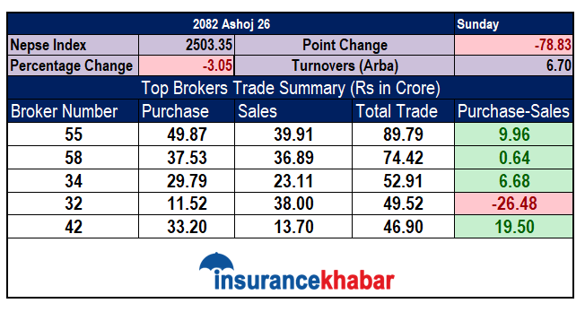 बजारमा ६ अर्ब ७० करोड रुपैयाँको कारोबार भएको दिन ब्रोकर नम्बर ५५ बाट सर्वाधिक रकमको कारोबार भएको छ। यो ब्रोकरबाट ८९ करोड ७९ लाख रुपैयाँको कारोबार भएको छ। जसमा ४९ करोड ८७ लाख रुपैयाँको खरिद भएको छ भने ३९ करोड ९१ लाख रुपैयाँको बिक्री भएको छ।