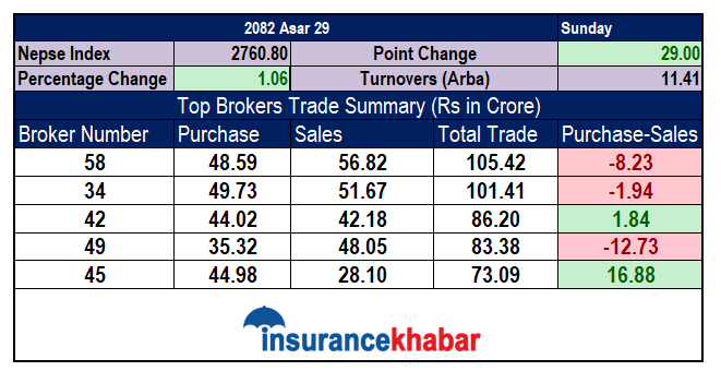 ब्रोकर नम्बर ५८ बाट १ अर्ब ५ करोड ४२ लाखको कारोबार भएको छ जसमा ४८ करोड ५९ लाखको खरिद भएको छ भने ५६ करोड ८२ लाखको विक्री भएको छ ।