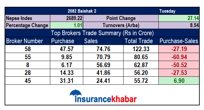 बजारमा ८ अर्ब ५४ करोड रुपैयाँको कारोबार भएको दिन ब्रोकर नम्बर ५८ बाट सर्वाधिक रकमको कारोबार भएको छ। यो ब्रोकरबाट १ अर्ब २२ करोड ३३ लाख रुपैयाँको कारोबार भएको छ। जसमा ४७ करोड ५७ लाख रुपैयाँको खरिद छ भने ७४ करोड ७६ लाख रुपैयाँको बिक्री छ।