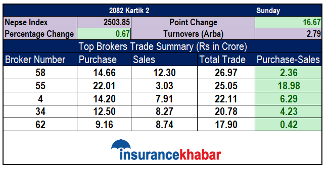 बजारमा २ अर्ब ७९ करोड रुपैयाँको कारोबार भएको दिन ब्रोकर नम्बर ५८ बाट सर्वाधिक रकमको कारोबार भएको छ। यो ब्रोकरबाट २६ करोड ९७ लाख रुपैयाँको कारोबार भएको छ। जसमा १४ करोड ६६ लाख रुपैयाँको खरिद र १२ करोड ३० लाख रुपैयाँको बिक्री छ।