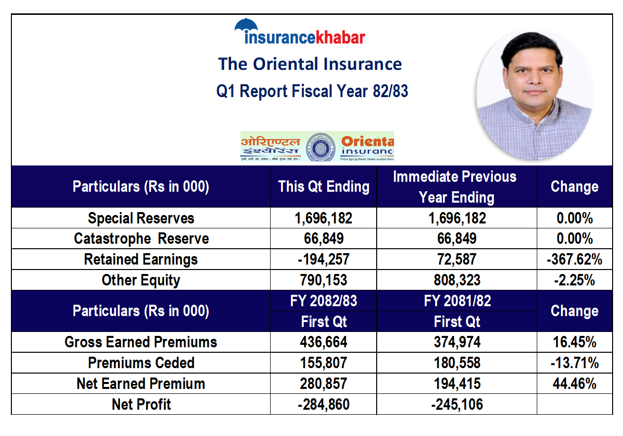 काठमाडौं । ओरिएन्टल इन्स्योरेन्स कम्पनीले आर्थिक वर्ष २०८२।८३ को पहिलो त्रैमाससम्मको अपरिष्कृत वित्तीय विवरण प्रकाशन गरेको छ । वित्तीय विवरणअनुसार कम्पनीको नाफा ऋणात्मक रहेको छ भने नाफा बाहेक अधिकांश सूचकमा वृद्धि देखिएको छ ।
