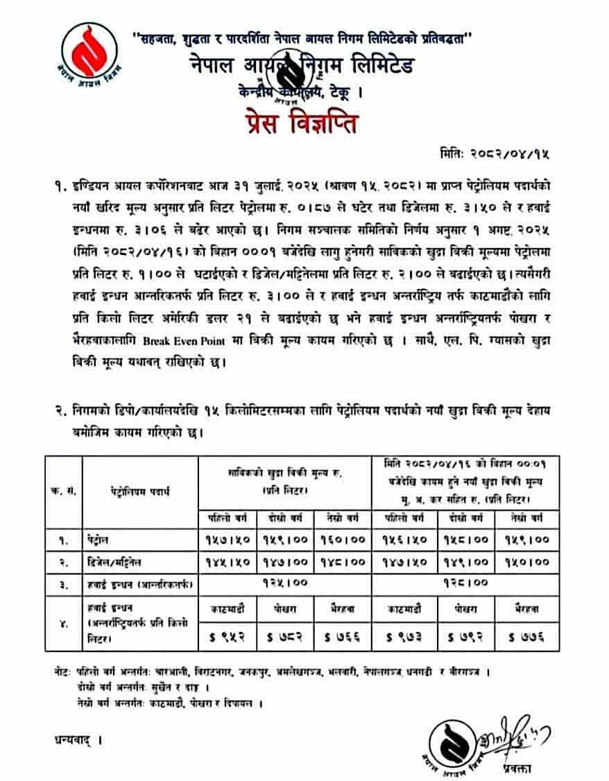 नयाँ समायोजित मूल्यअनुसार पेट्रोलको भाउ घटेको छ भने डिजेल, मट्टीतेल र हवाई इन्धनको भाउ बढाएको छ। प्रतिलिटर पेट्रोलमा १ रुपैयाँ मूल्य घटेको छ। प्रतिलिटर डिजेल र मट्टीतेलमा २ रुपैयाँले मूल्य बढेको छ।