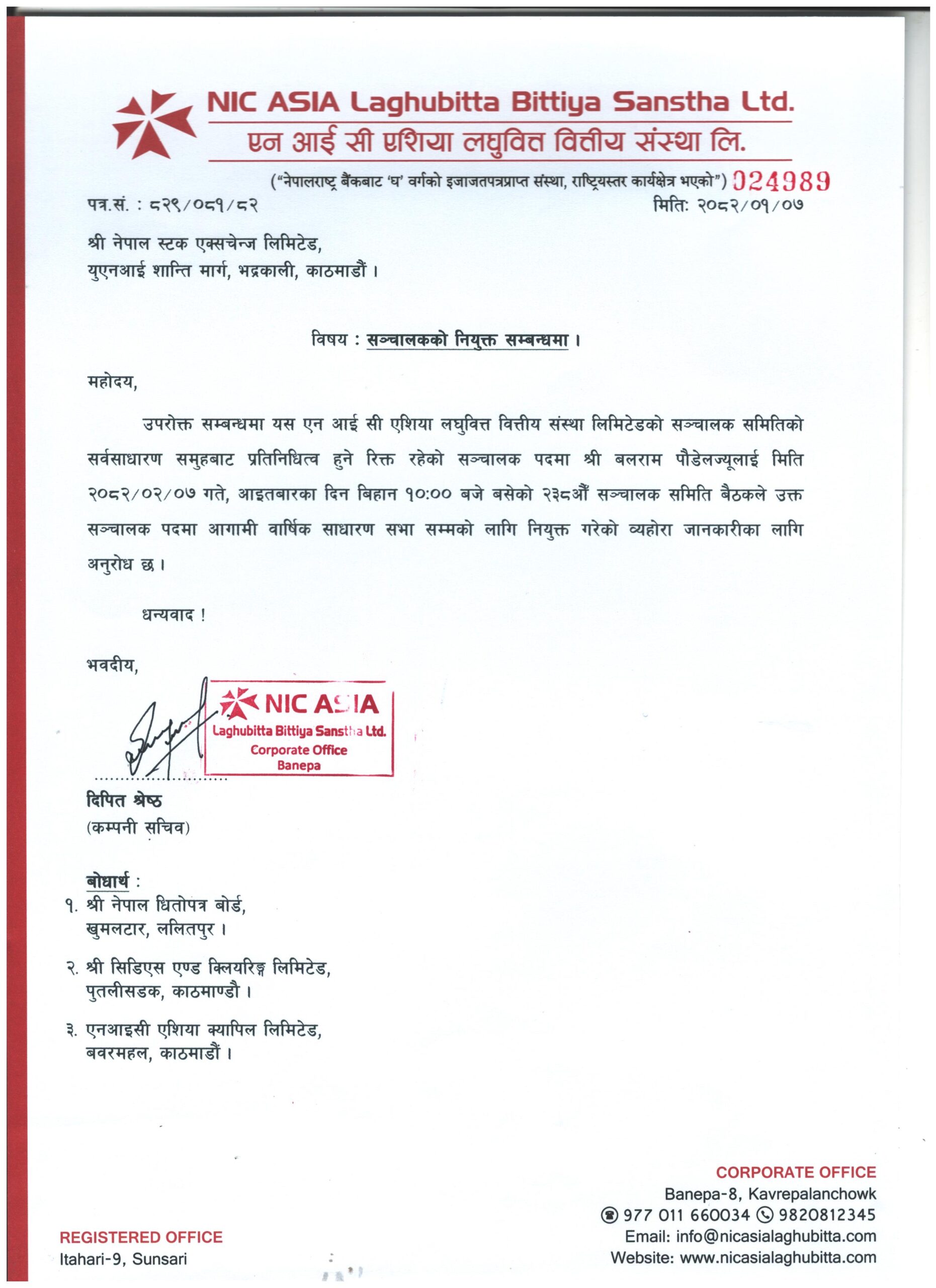 काठमाडौं । एनआइसी एशिया लघुवित्त वित्तीय संस्थाको सञ्चालकमा बलराम पौडेल नियुक्त भएका छन् । संस्थाको आज वैशाख ७ गते बसेको सञ्चालक समितिको बैठकले उनलाई आगामी वार्षिक साधारण सभा सम्मका लागि नियुक्त गर्ने निर्णय गरेको हो ।