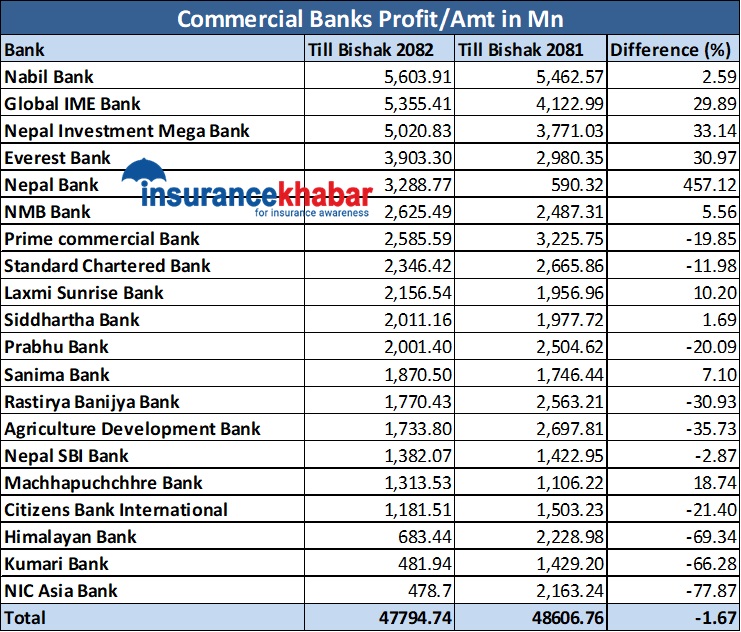 समीक्षा अवधिसम्म १० वटा बैंकको नाफा बढेको छ भने १० वटाकै घटेको छ। समीक्षा अवधिसम्म सर्वाधिक नाफा कमाउने नबिल बैंक अग्रस्थानमा रहेको छ। नाफा वृद्धिको हिसाबले नेपाल बैंक अगाडि रहेको छ।