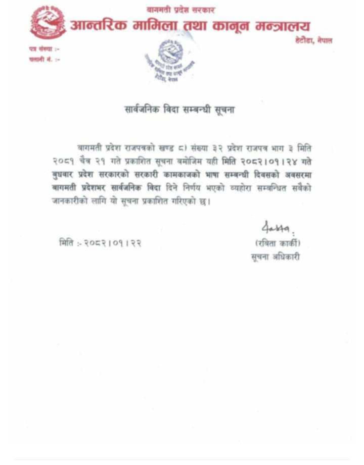 काठमाडौं । बागमती प्रदेश सरकारले बैशाख २४ गते बुधबार सार्वजनिक बिदा दिने निर्णय गरेको छ । यही बैशाख २४ गते सरकारी कामकाजको भाषा सम्बन्धी दिवसको अवसरमा बागमती प्रदेशभर सार्वजनिक बिदा दिने निर्णय गरेको हो ।